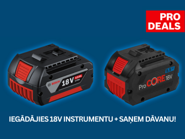 Iegādājies Bosch Professional 18V elektriskos – dārza – mērinstrumentus, akumulatorus un lādētājus virs € 423 (iesk. PVN) un saņem ProCORE18V 5,5 Ah akumulatoru bez maksas. Pasteidzieties, dāvanas pieejamas tikai tik ilgi, kamēr tās ir noliktavā.